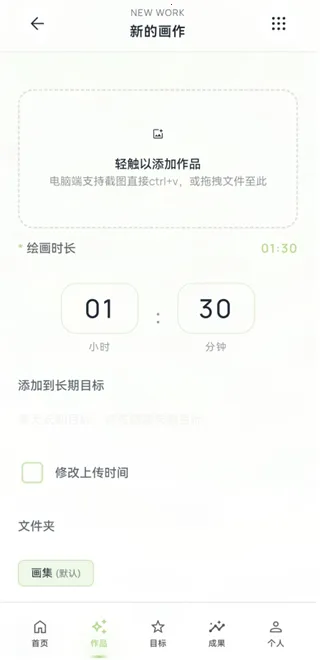 2、点击上方虚线的区域添加作品,你可以设置绘画时长。