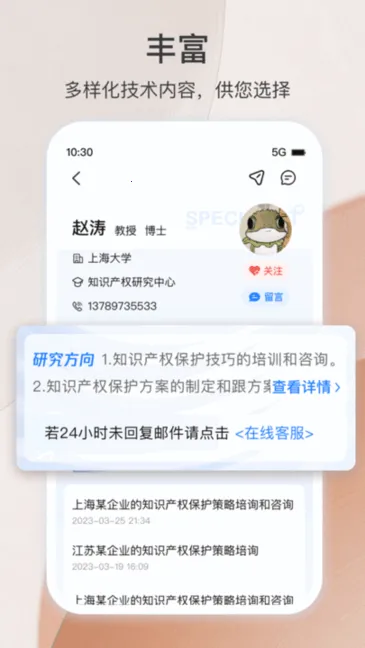对企业来说,在这里能轻松找到感兴趣的科研项目,还能和各个研究领域的学者、研究人员交流,打造自己的线上学术圈,通过即时聊天和话题讨论等方式开展学术交流,推动企业项目业务升级,让科研技术多样发展。软件操作易用便捷,随时随地都能和企业达成合作,还有丰富多样的高价值技术内容可供选择。不管是搞科研的人员想分享交流成果,还是企业有技术服务需求,科企岛都能满足,真的非常方便实用,赶紧来下载体验吧!