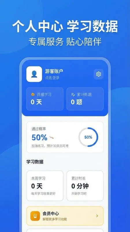 4. 可在个人中心了解学习数据,还能从app直接预约考试,一站式办理驾考相关事宜,为您提供极大便利。
