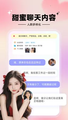 甜心伴聊是专为中年人的同城交友平台,女性用户真人认证、资料严审。有基于位置一键速配,多种交流方式,动态广场助了解,高品质视频通话。致力于打造真诚安全环境,新版修复 BUG 提升体验。