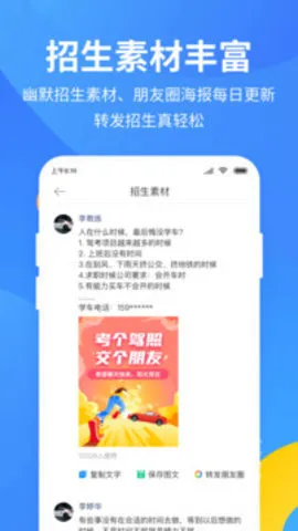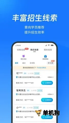 1. 招生便捷:能迅速获取学员咨询信息,还有海量真实招生线索,一键生成驾校名片方便分享,助力招生工作高效开展。