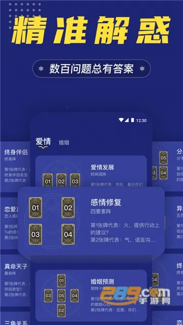多种塔罗种类:拥有爱情、事业、婚姻、学习、财运、运程、人际、健康、我的、综合、占星等11种不同种类塔罗,全面覆盖生活各方面。