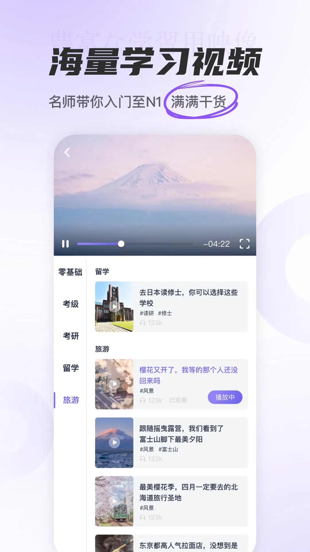 3. 趣味学习体验:趣味视频还原真实日本生活、文化,高颜值日星的可爱日常,寓教于乐,让用户从文化中汲取知识,告别枯燥课程。
