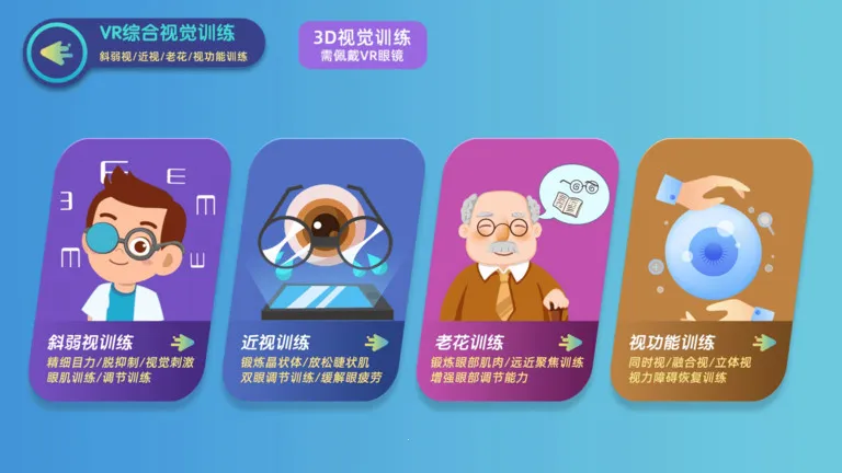 3. 多元化训练法:包含弱斜视视功能和老花训练等多种训练模式,满足不同年龄层的视力需求。