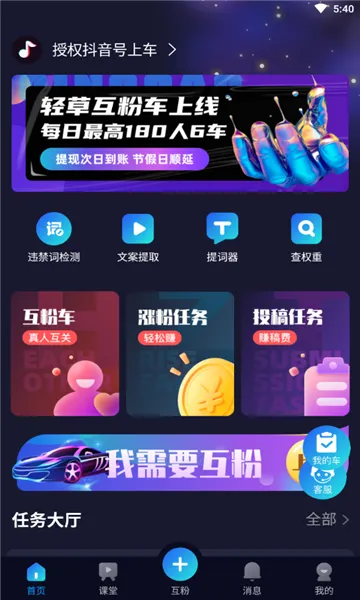 营销变现渠道多元,设有涨粉投稿等营销任务,搭配互粉车玩法,为内容变现与粉丝增长开辟有效路径,让创作者实现价值转化。