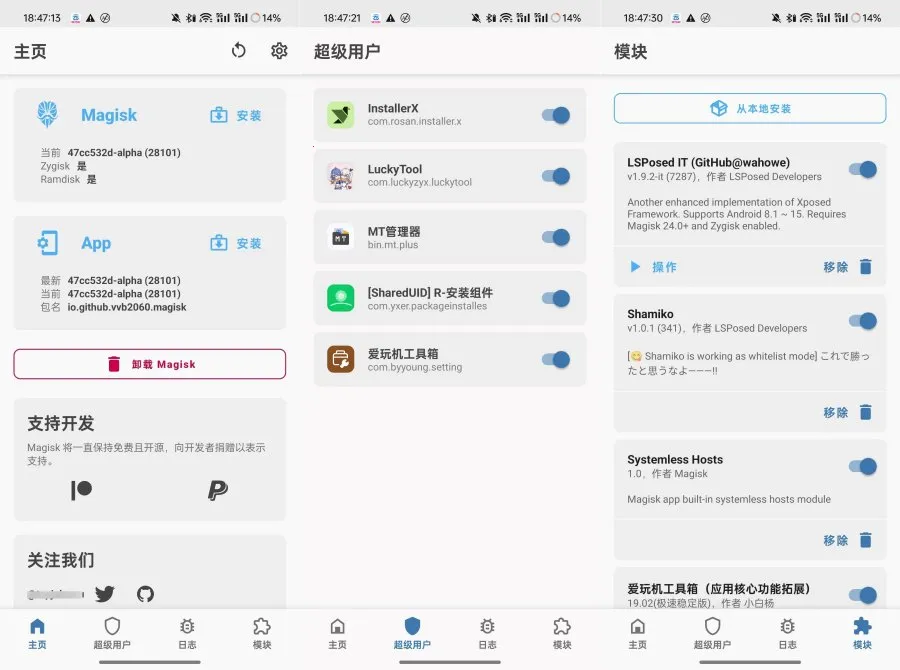 它有不少实用功能。magiskmanager能帮你管理root状态和magisk模块;specialcachemode支持在特定条件下运行,拓展了magisk的可能性;systemlesshosts让修改hosts的广告屏蔽软件直接使用systemless模式;magicmount可替换或创建system文件及文件夹;multipleentrypoints能在系统启动暂停点运行脚本。