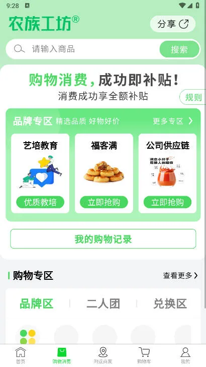 3. 购物专区丰富,有品牌专区、二人团及兑换区等。