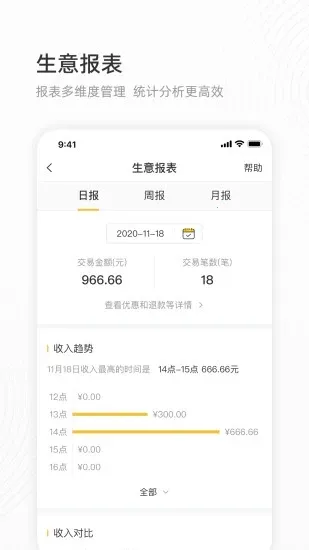 4. 具备 账单多维度统计功能,清晰呈现每天生意报表,助您更好地管理店铺经营,全面掌握经营情况。