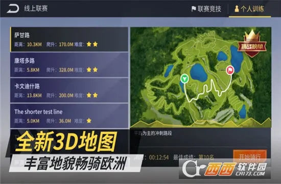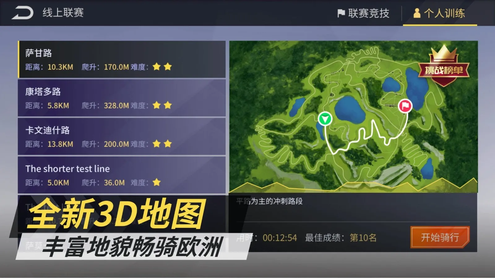 3. 3D骑行地图出色:全新制作的3D骑行地图伯尔尼高地,风格为森林地貌,有爬坡、耐力和丘陵三种路线类型,多样路线长达百公里,全面提升骑行体验,满足骑手目标。