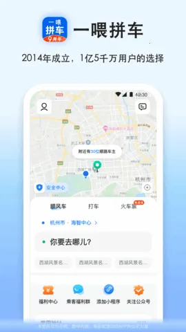 拼车是一款出行打车软件,由杭州一喂智能科技有限公司制作发行。提供车主、乘客模式,系统智能匹配路线,保障安全。多种拼车方式,覆盖超360个城市,计价灵活,还有优惠,能满足不同出行需求。