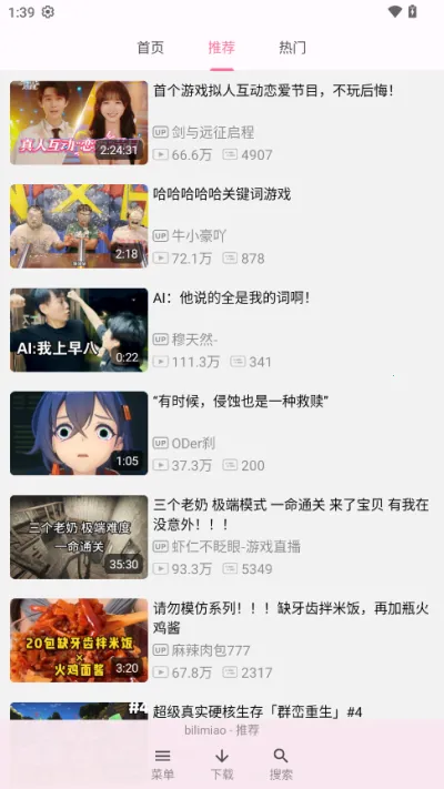 bilimiao哔哩喵是一款超棒的第三方B站客户端。它功能强大,能解决不少问题。安装包小巧,不占手机太多空间,还没广告,能带来沉浸式体验。有时光回溯功能,可浏览B站不同时期的音乐视频、番剧等。在使用上很方便,比如调整应用内DPI解决手表文字过大问题,设置默认全屏播放等。还能屏蔽关键字,让视频列表更合心意。这里有最新连载动画、优质音乐,官方动漫每日更新,还有热门游戏视频、海量纪录片资源。能免登录下载视频,默认最高画质。智能推荐会根据你看的视频推感兴趣的内容。总之,它能满足你在B站看视频、找资源、个性化设置等各种需求,给你带来便捷又丰富的B站浏览体验。