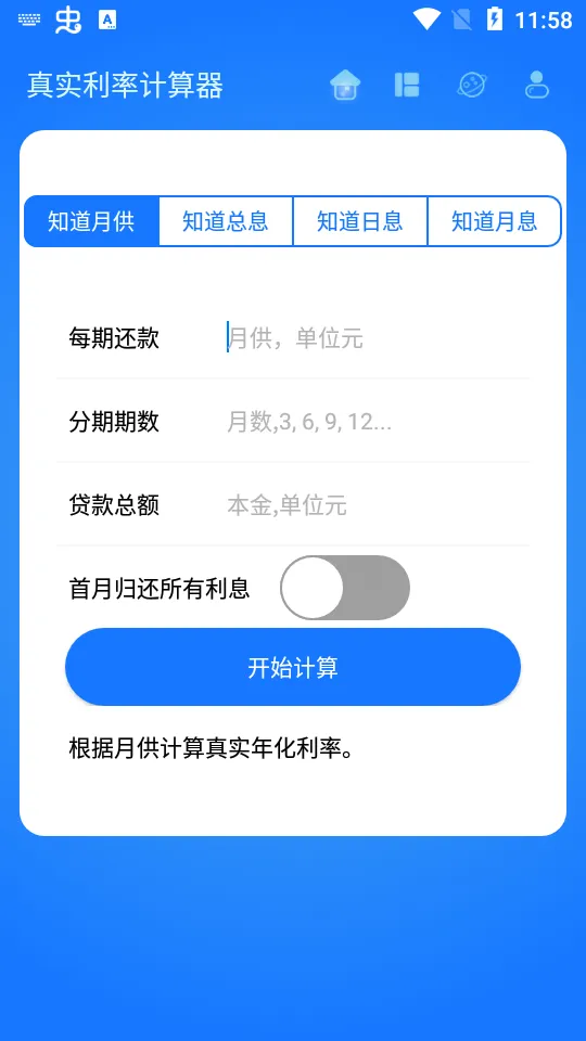 真实利率计算器最新手机版是一款优质利率计算软件,能算商业贷款真实利率,支持多种输入模式,有房贷、信用卡分期等专项计算工具,结果准确,功能免费,含语音播报等亮点,助用户轻松应对贷款计算。