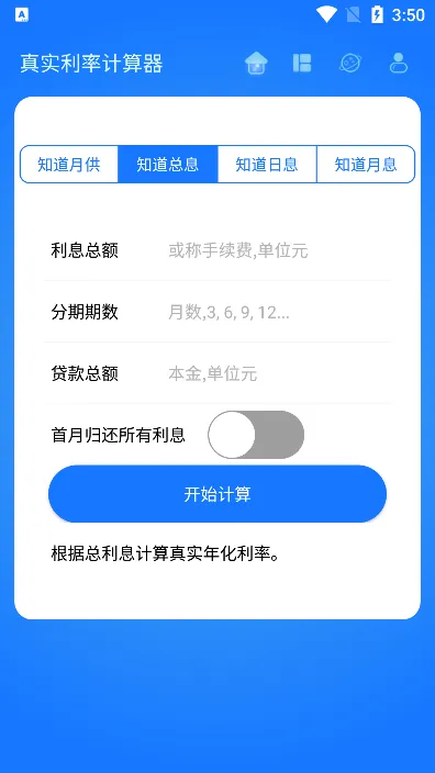 1. 计算模式多样:支持每期还款额、分期期数、贷款总额、利息总额等5种输入模式,不管是何种情况,都能准确计算真实年化利率。