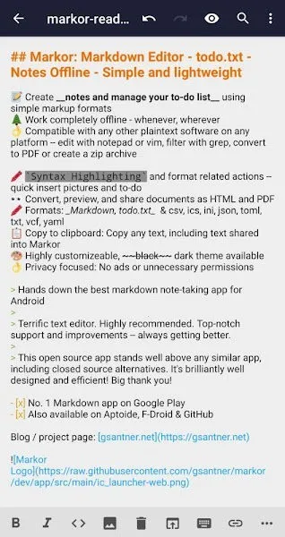 Markor是一款笔记待办app,支持Markdown格式,可记录待办事项、编辑笔记,能导入多种格式文档,支持打压缩包、文本复制。工作完全脱机,兼容其他明文软件,功能丰富且免费无广告,高度可定制。