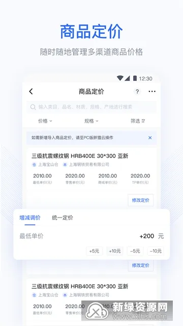 胖猫云是一款超棒的钢贸生意服务手机软件。它能全方位覆盖钢材贸易各环节,像采购库存管理、销售订单处理、物流配送跟踪等。有采购管理,能高效跟踪采购,让合同执行更顺畅;销售管理可跟单,使交易信息可视化。库存管理能预留库存,规避超卖超发。客户管理可分级分析,全面了解客户。财务管理能清晰对账,让财务余额、现金流一目了然。还有数据赋能,智能报表助力管理决策更高效,支持计息、不定规格加工等特色功能。通过它,能实现业务流程高度整合优化,减少繁琐流程和信息传递障碍,提高工作效率,降低出错概率。管理者能实时掌握业务动态,做出明智决策,为钢贸企业发展注入强大动力,轻松解决各类钢材贸易相关工作问题,是钢贸企业的得力助手。