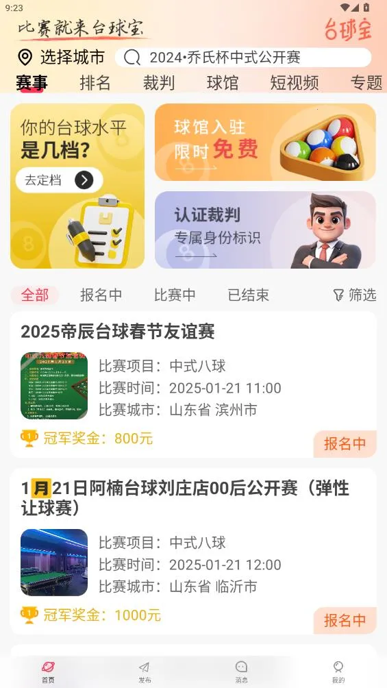 如果你想知道“台球宝贝是什么意思”,那台球宝app能给你答案。它是台球爱好者的聚集地,有丰富功能。赛事系统能呈现各类精彩赛事,可在线看也能报名参与,感受赛场氛围。球馆功能展示周边球馆信息,方便找合适场所。短视频板块有技巧分享等,助你轻松提升球技。商城有海量台球器材满足购物需求。特色方面,视频直播清晰流畅,能记录分享精彩,还能结交球友。专业完整的赛事功能支持复杂赛事,不用担心规则和管理问题。丰富资讯信息,找球馆、买器材等需求都能满足。注册登录后,设置比赛用名,通过赛事列表或搜索栏搜索赛事名称就能报名。总之,台球宝app能一站式解决你在台球方面的各种需求,带来诸多便利,快来下载享受台球乐趣吧!