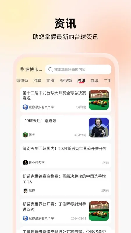 4. 全面资讯支持:不管是找球馆、找优惠、买器材、看资讯、招伙伴还是出二手,都能提供帮助,为台球爱好者提供全方位服务。