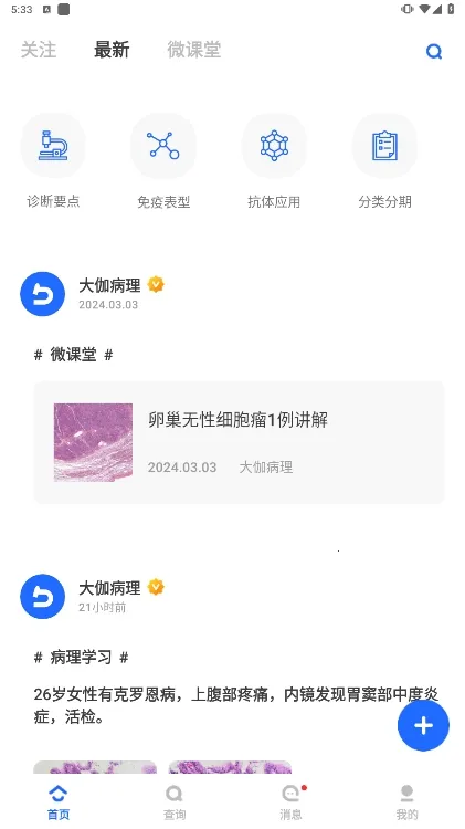 大伽病理 2026 官方正版是病理诊断专业工具,含知识库查询、社区互动及微课堂等核心模块,整合权威内容与专家资源,支持安卓和 iOS 系统,助力病理从业者精准诊断与专业交流,有多种特色功能。