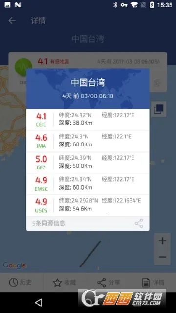 3. 地图显示直观:集成地图模式,直接在地图上显示地震信息,简单明了方便快捷,还能分享。