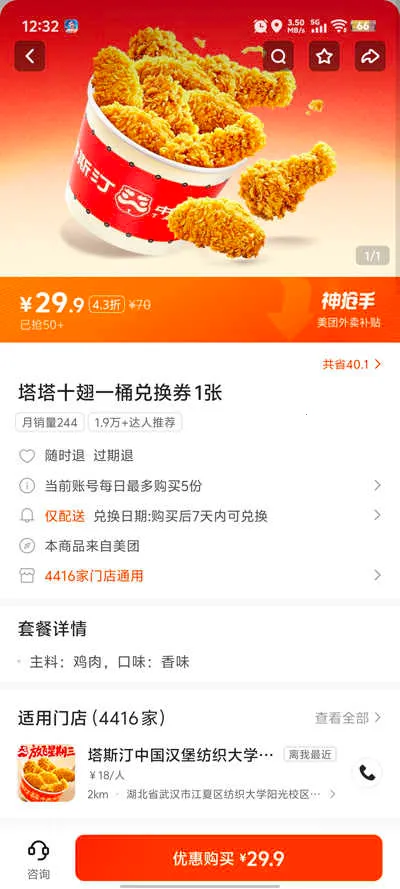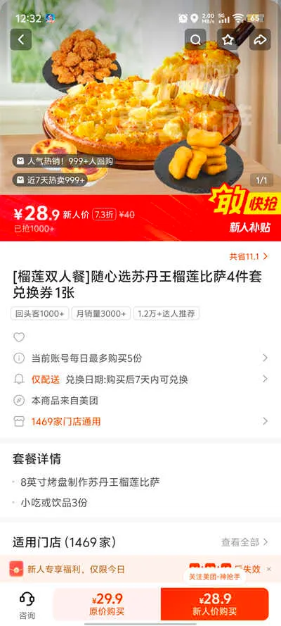 在商品详情页确认规格、份数及可用优惠,点击“优惠购买”按钮进入结算流程。
