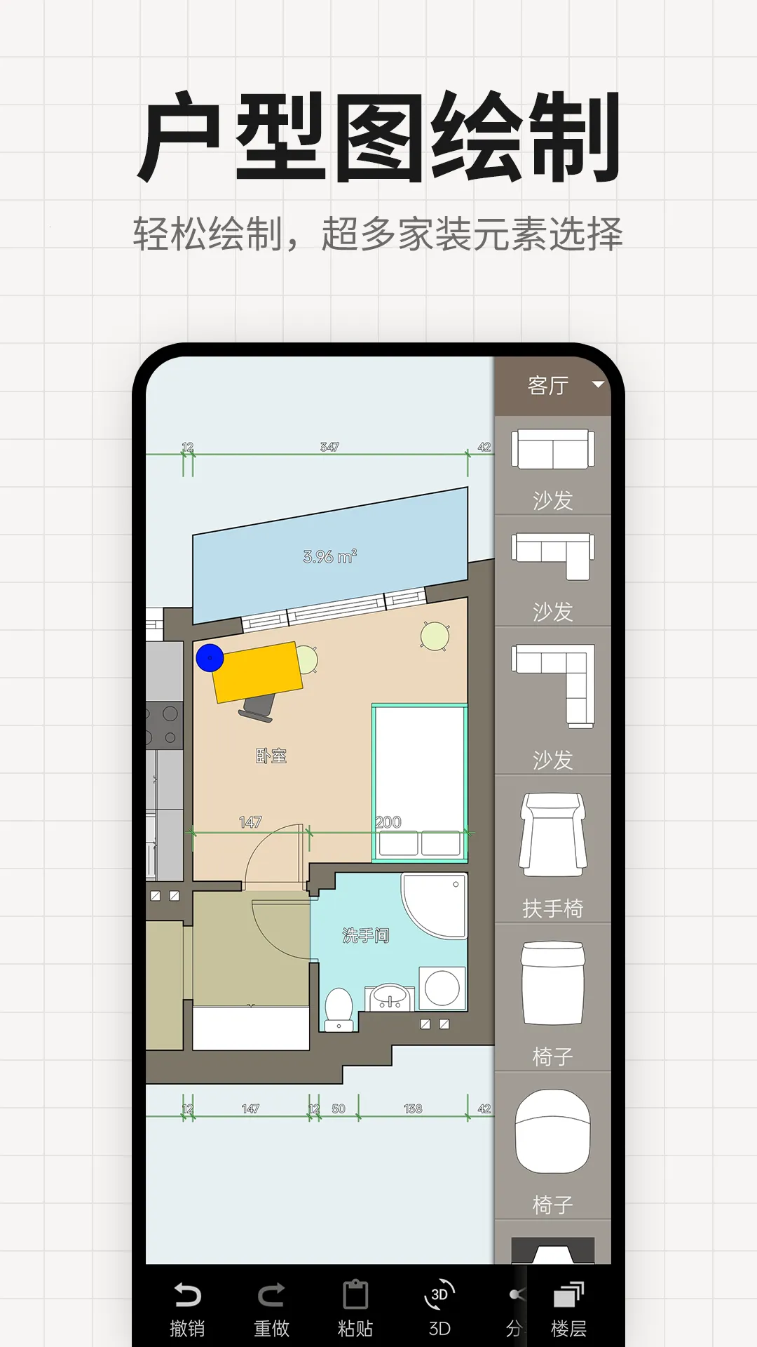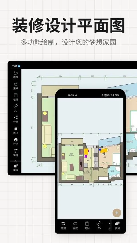 4. 操作便捷灵活:具备便捷编辑工具,能轻松完成平面图设计,绘图时对于绘制错误的步骤可一键撤销重做,还有一键粘贴素材等功能,让绘图更高效简单,并且支持S - Pen和鼠标操作,以及3D游览模式,带来不一样的设计体验。