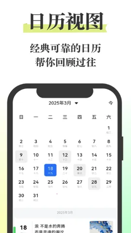 3. 视图简约便捷:简约的日历视图,能让你更清晰直观地查看日记,快速定位所需内容,节约时间,轻松回顾历史日记。