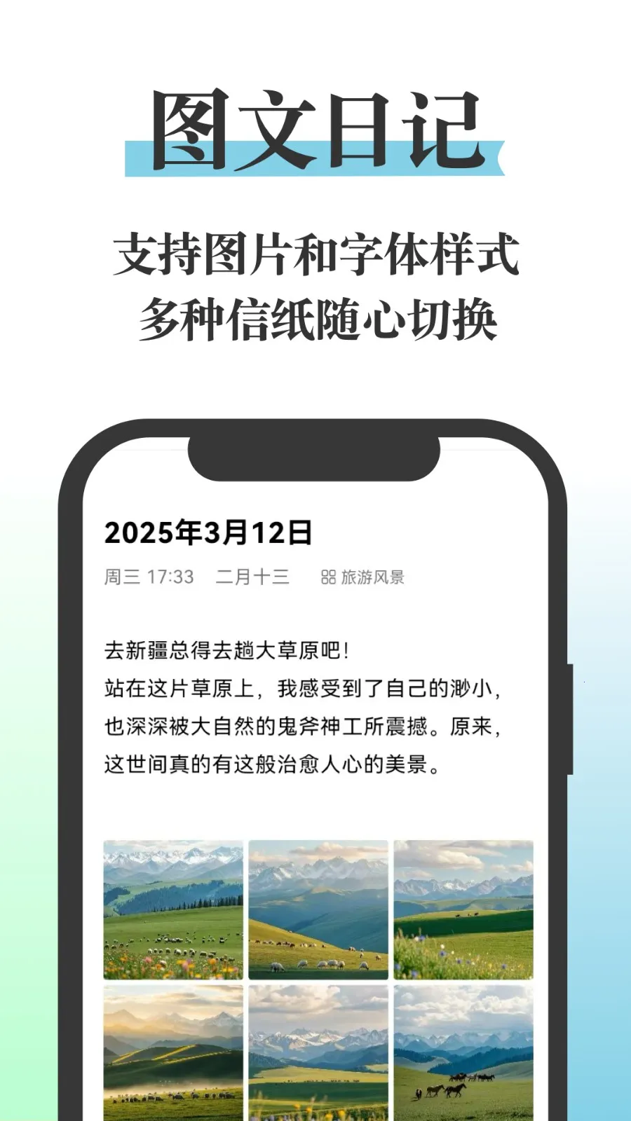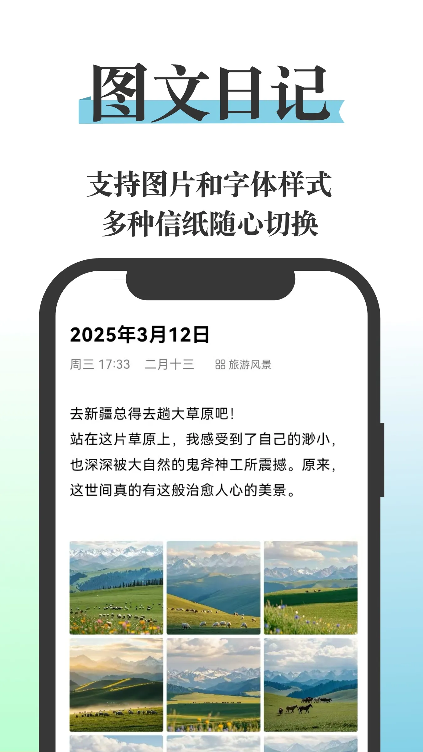 1. 记录方式多样:可通过文字与图片组合记录,清晰全面留存生活点滴,无论是日常琐事、成长瞬间还是旅行见闻,都能生动展现。