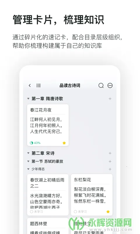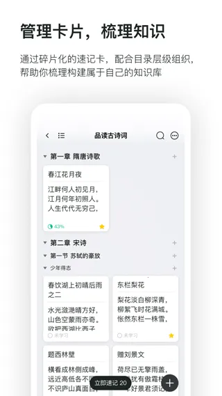 滑记手机版界面清新,采用水墨风格且十分简约,备受用户喜爱。交互形式独特,左滑右滑的方式带来别样学习爽感。平台资源丰富,已有近乎完整的生态,全网学习卡册数量庞大。它还能根据用户需求自动生成学习计划,若后续版本实现自定义则更完美。其能帮用户高效记忆知识点,通过AI算法规划复习计划,还有定时复习、记忆重点等功能,支持跨平台同步,是款助力学习的优质软件。