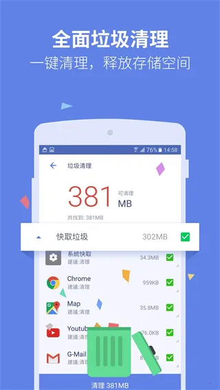 2. 能扫描出手机应用产生的缓存,以G为单位清理垃圾,还手机干净大容量。
