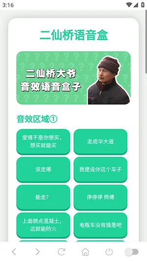 二仙桥大爷语音盒是免费语音软件,集合谭谈交通中二仙桥大爷经典语音素材。无需付费,有多种播放模式,支持一键分享。界面简洁易用,语音持续更新,能带来轻松愉快体验,适合多种场景。