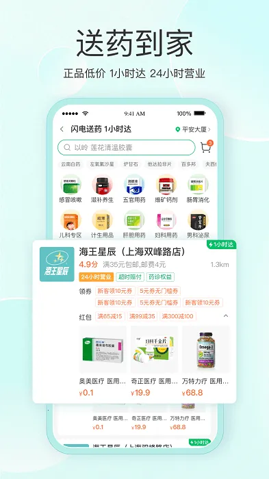 全国64城市支持1小时闪电送药服务,超时赔付,常用药专科药一应俱全。