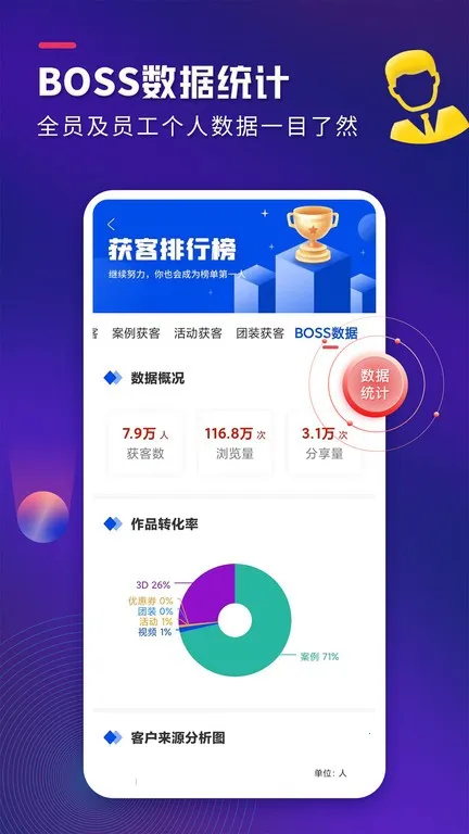 4. 多维度助力提升:有员工获客数据分析看板,能进行多维度作品与数据展示,全方位帮助装企提高营销效果与工作效率。