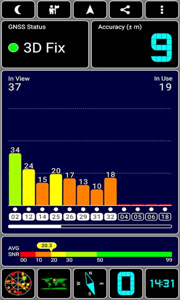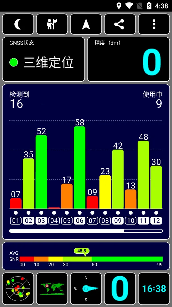 1. 全星系卫星监测:支持GPS、北斗、GLONASS、Galileo、QZSS、SBAS六大系统,圆形雷达图实时显示每颗卫星位置与信号强度,直观区分各国卫星,搜星数量与质量一目了然。