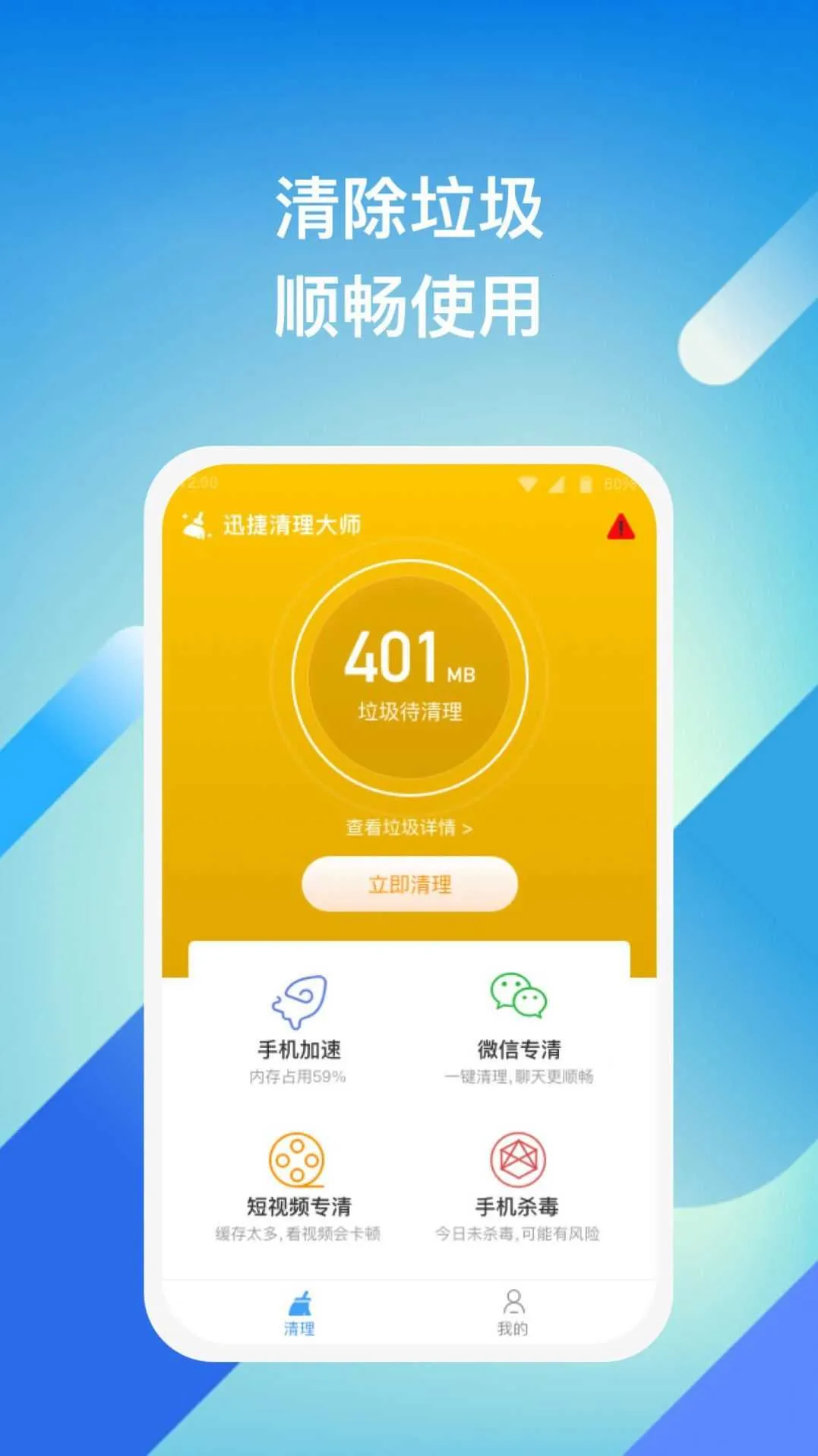 迅捷清理大师2026官方最新版本是一款功能强大的手机垃圾清理工具。能一键扫描清理各类垃圾,拦截查杀病毒,还有手机加速、微信清理、超强省电等功能,支持自动清理,可扩大内存、保障安全、延长续航,操作简单便捷。