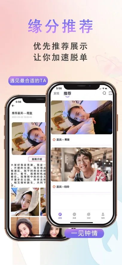 拥有多种便捷功能,如发现板块根据会员信息推荐优质异性,聊天支持多种方式,活动可在线报名查看,还有扫一扫、实名认证等,满足你的交友需求。