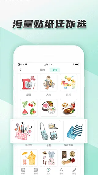 1. 海量素材随心搭:拥有数千种免费素材,像壁纸、贴纸、胶带、字体等,复古、卡通、水彩等风格应有尽有,满足多样创作需求。