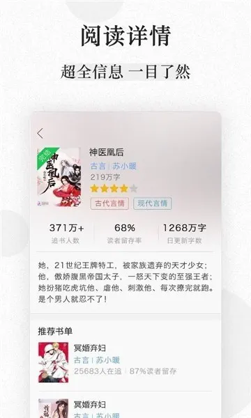 这款小说软件资源超丰富,涵盖各类小说,能满足不同用户阅读需求。更新速度快,连载小说及时更新,还提供免费内容。支持多种阅读模式,操作简单流畅,通过关键词搜索能快速找到感兴趣的小说。特别设置了书籍评论区,读者可分享感悟,还能在线创作投稿。此外,有听书功能,解放双眼。购买书籍流程简便,具备强大的IP开发能力。致力于构建优质平台,提升加载速度,推送更新提醒,让用户畅享免费阅读乐趣。