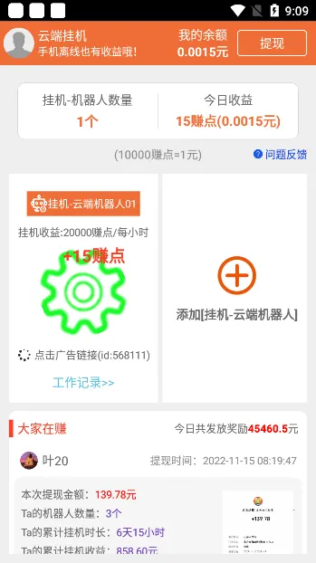 云端挂机最新版2026是一款高效便捷的挂机赚钱应用。提供多样任务,支持自定义挂机时间,无收入上限。具备强大离线挂机功能,有root权限,全天候服务。正规绿色,操作简单,完成任务即可获奖励,随时提现。