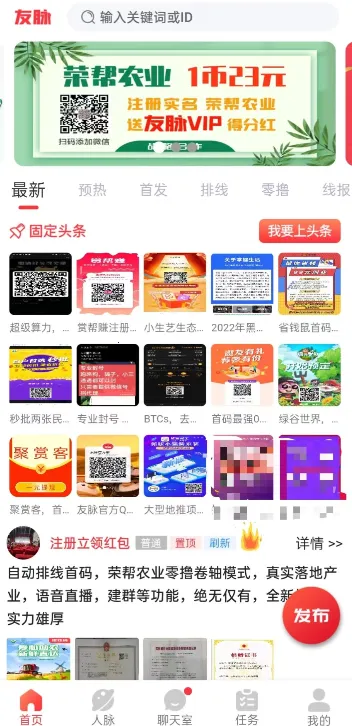 友脉app是一款超棒的软件。它专为电商打造管理服务平台,能帮你推广商户、搞定人脉。这里任务丰富,能满足多样兼职需求,不同任务划分详细,在大厅就能看到所有任务信息,而且所有任务在线就能完成,足不出户体验兼职乐趣。玩法简单,还能让你领略世界各地风景,旅游中提升等级,等级越高赚金币越多,金币直接进账户,随时可查明细。它是专为商户打造的流量引流应用,能帮用户提高商铺效益。效益获得无门槛、无限制,线上快捷提现。免费为用户提供实用帮助,提升店铺效益。很适合学生党和自由职业人,利用人脉就能赚取更多零花钱,轻松解决兼职和赚钱问题,带来诸多便利。