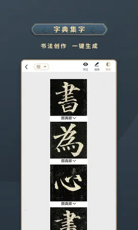 2. 功能全面实用,有碑帖库、书法字典、集字创作、创作模板库等。碑帖库方便分类查找与收藏;书法字典可查单字多种写法;集字创作能自定义内容风格;创作模板库提供多样格式,降低创作门槛。