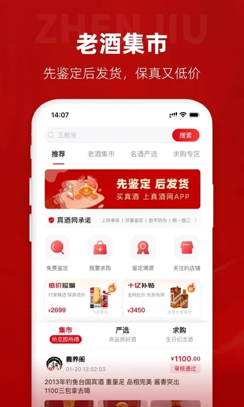 真酒网app是专注名酒交易与鉴定的平台,有专业鉴酒师严格鉴定,保证质量与真实性。提供多种名酒,有先鉴定后发货功能,还有丰富图谱、鉴酒学院。新人登录享优惠,能抽飞天茅台,是酒友购酒及学习的好选择。