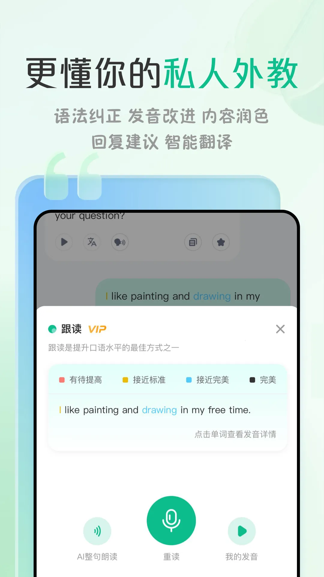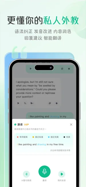 2. 智能纠错反馈:引导式口语练习搭配即时评估,让每个发音细节都得到修正,提升语言精确度。
