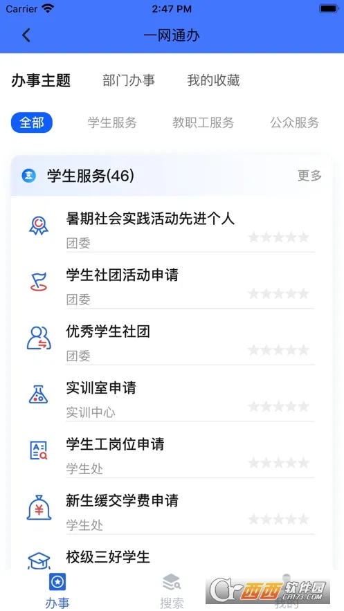 2. 统一办事流程:为用户提供统一咨询服务,解决办事服务中的难点堵点问题;实现全校范围内快速查找服务事项的统一查询服务,一网搜索;教职工部门事项负责人可在工作台处理审批、咨询和评价,完成统一事项办理,办事更高效。