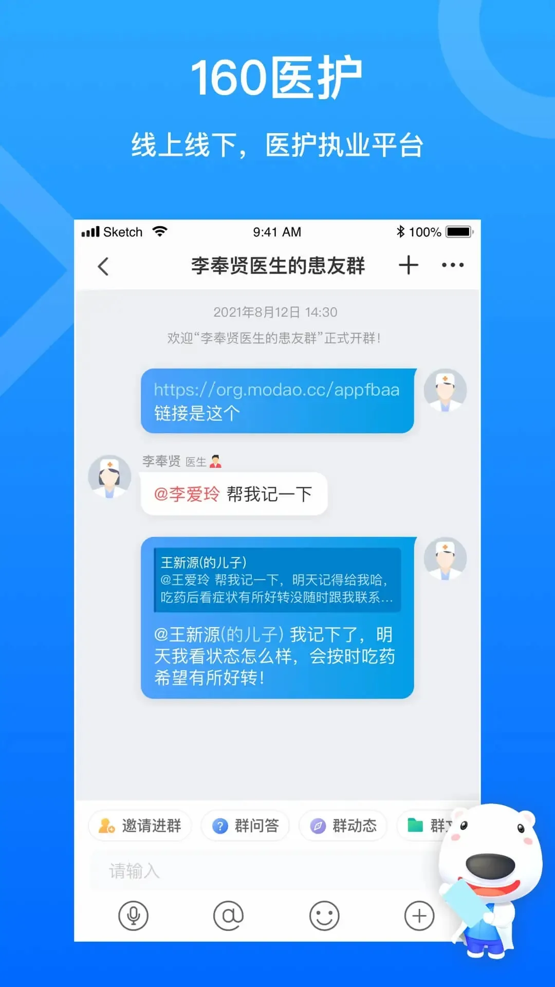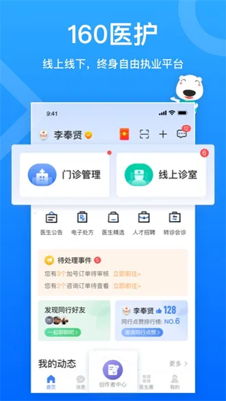 160医护是健康160打造的医生终身自由执业平台,面向1.7亿用户。帮医生打造专属移动诊室,提供多种诊疗工具,可图文、音频、视频等方式答疑,还有预约管理、医患群等功能,提升医生阳光收入。