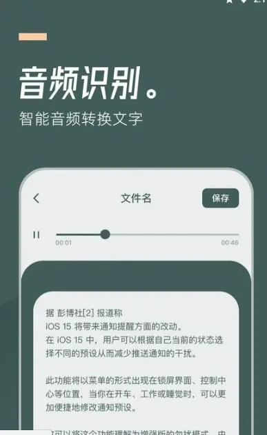3. 功能丰富:可进行实时录音,并快速将录音内容转换提取为文字,还支持分享多种文档格式导出。此外,能随时获取手机音频文件进行内容识别提取,支持文字音频互转,甚至可以提取背景音乐,满足多样需求。