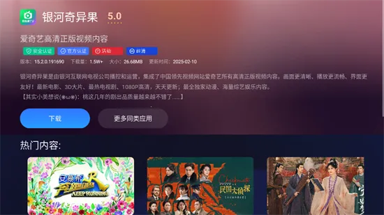 这款软件界面简洁明了,分类清晰,方便用户快速找到所需应用。支持搜索功能,输入关键词就能精准检索。它具备高速下载能力,还提供自动更新,确保用户使用最新版本。软件对上架应用严格审核测试,安全可靠,让用户放心下载。其亮点众多,能根据用户下载历史和浏览记录智能推荐,有详细分类浏览功能,支持对已下载应用进行管理,如卸载、更新等,还具备应用备份恢复功能,且支持多种智能电视和电视盒子设备,兼容性强。