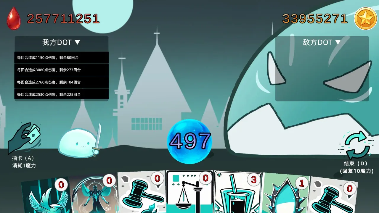 回合制卡牌对决,每回合魔力自动恢复,让你能持续稳定地进行战斗,不断释放卡牌叠加DOT效果,逐步积累优势。