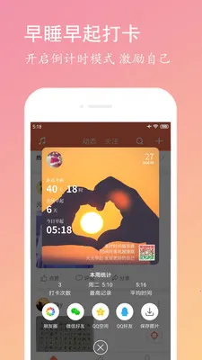 专属打卡卡片,记录成长点滴:天天早起为用户提供了丰富的打卡卡片,每天早起打卡后即可查看相应的打卡卡片,为你显示了连续早起的天数、今日早起的时间等信息。这些卡片不仅是你早起的见证,更是你坚持的动力。你还可以将卡片分享到其他平台,与朋友一起分享你的早起成果。