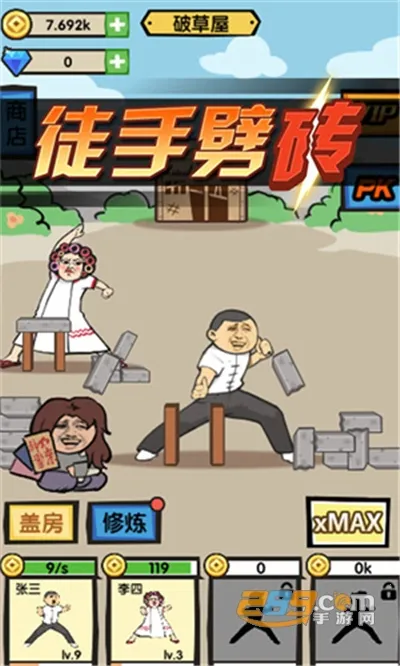 3. 提升实力:随着关卡推进,玩家实力逐步提高,劈砖效率提升,能更快速完成任务领取奖励,还可解锁加速挂机权益购买各种材料资源,实现盖房、娶妻等目标。