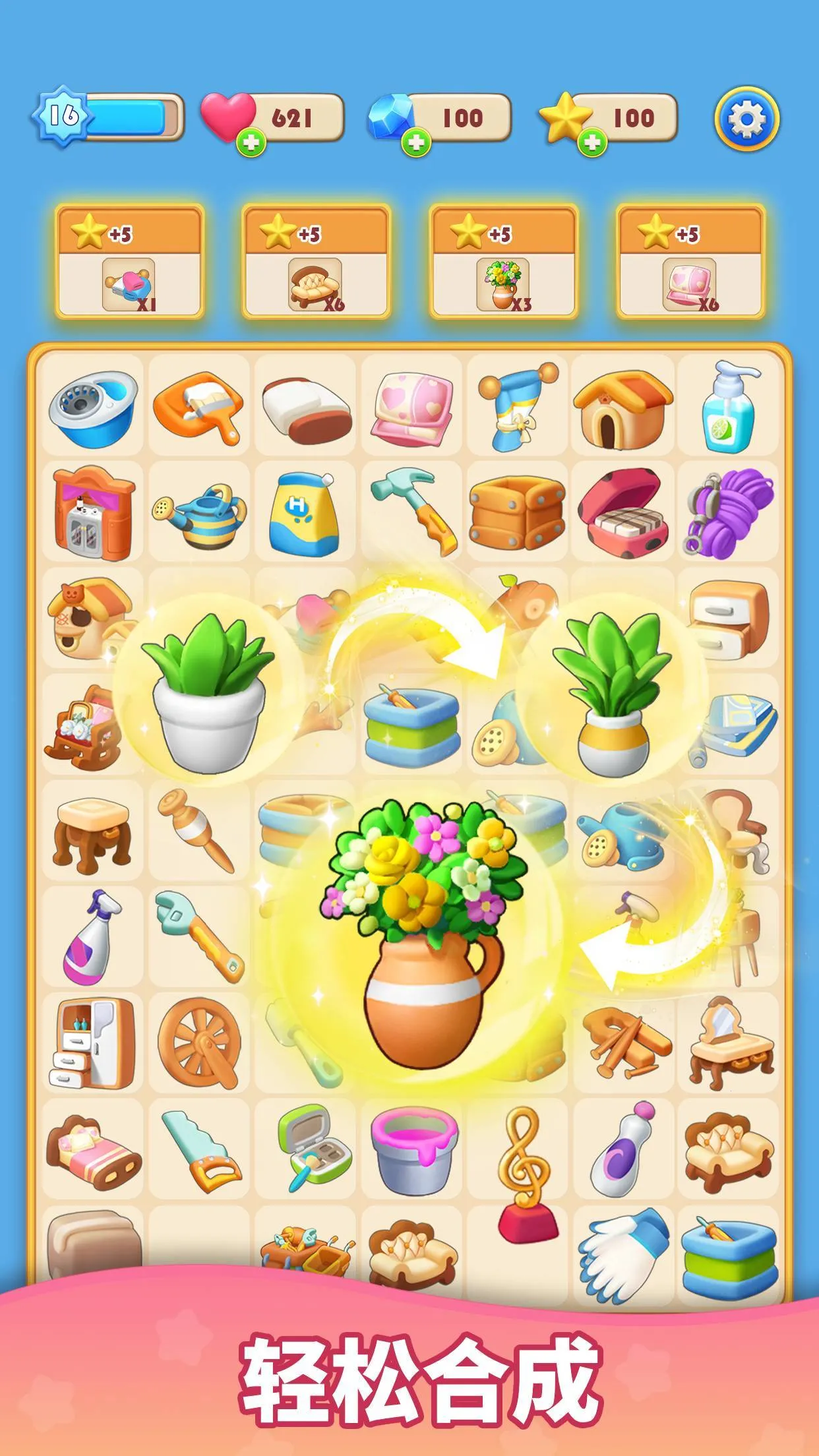 1. 轻松上手:合并拼图游戏板上的相同元素,就能创造新物品和工具,轻松翻新各类房间。